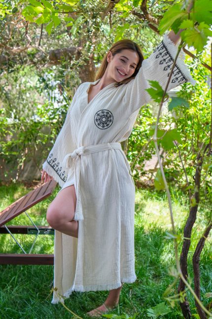 Müslin Peştemal Bornoz Nakışlı Kimono Kaftan Elbise %100 Pamuk Plaj Elbisesi